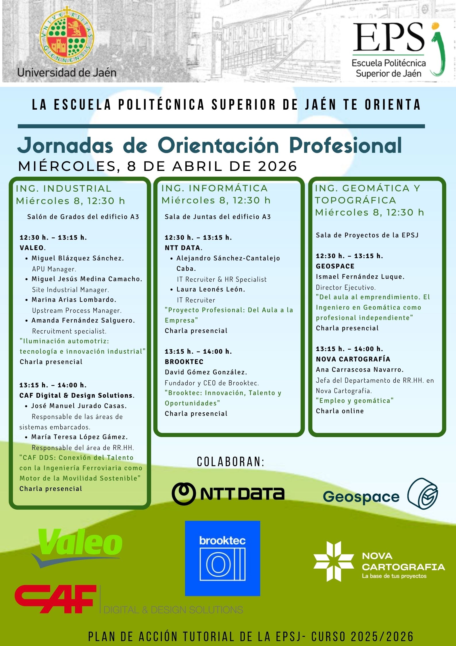 La Escuela Politécnica Superior de Jaén (EPSJ), celebrará el próximo miércoles 8 de abril de 2026 a las 12:30 h en el Salón de Grados de la EPSJ (Ingeniería Industrial), Sala de Juntas de la EPSJ (Ingeniería Informática) y Sala de Proyecto de la EPSJ (Ingeniería Geomática y Topográfica) una nueva edición de sus Jornadas de Orientación Profesional, una actividad clave dentro del Plan de Acción Tutorial (PAT) del centro.