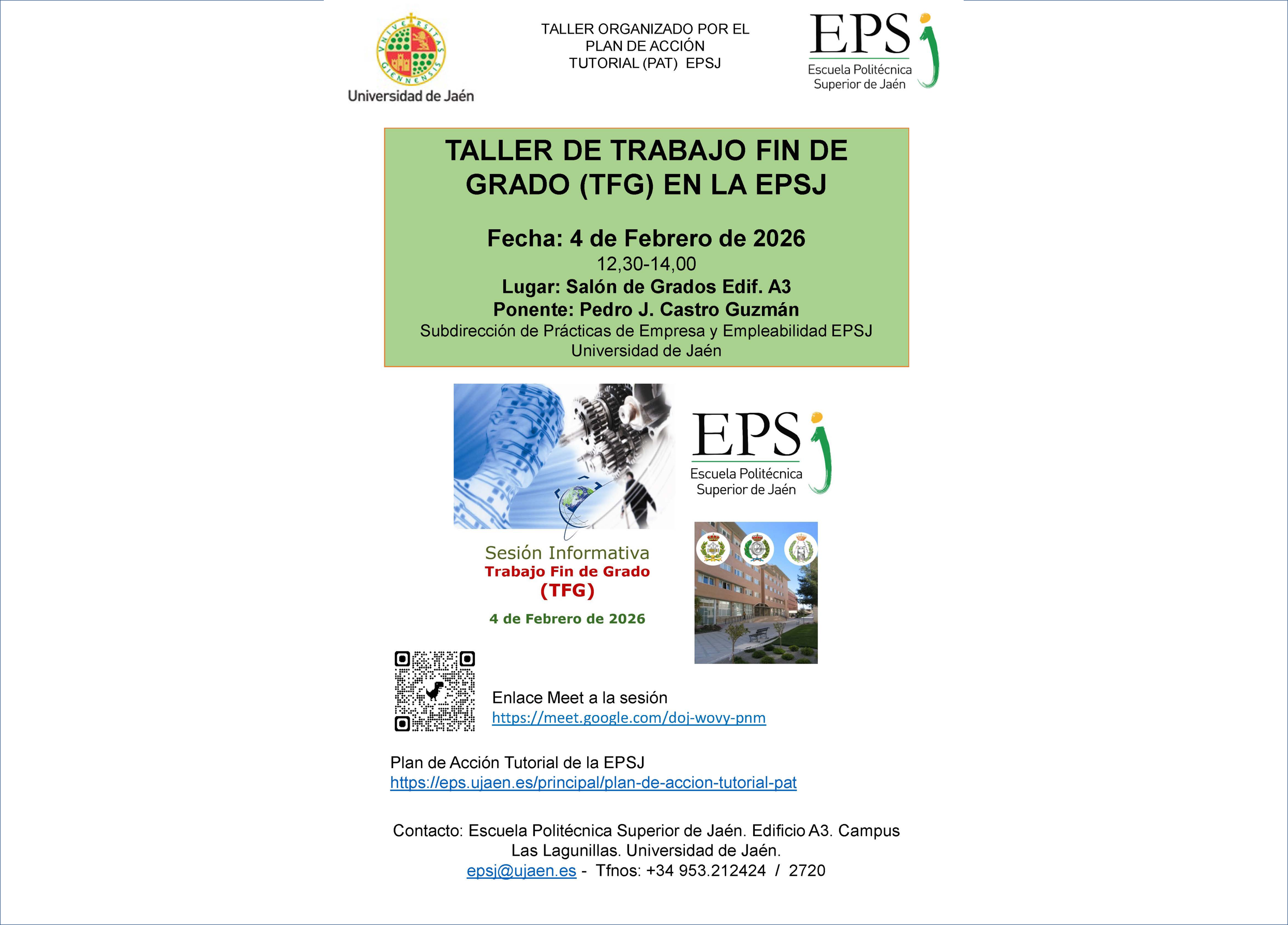 El próximo miércoles 4 de febrero, a las 12:30 horas, en el Salón de Grados del edificio A3, tendrá lugar una sesión informativa en el marco del Plan de Acción Tutorial (PAT) de la Escuela Politécnica Superior de Jaén.